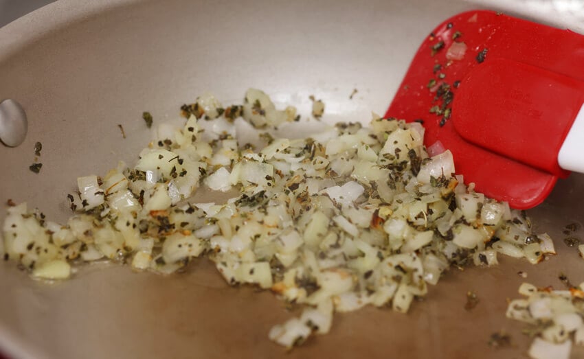 Add the dried oregano to the pan and stir into the remaining oil and onions. As the oregano infuses with the oil and warms, it will become fragrant. This is called ‘blooming’ or toasting your spice, which brings out more natural oils of the herb.