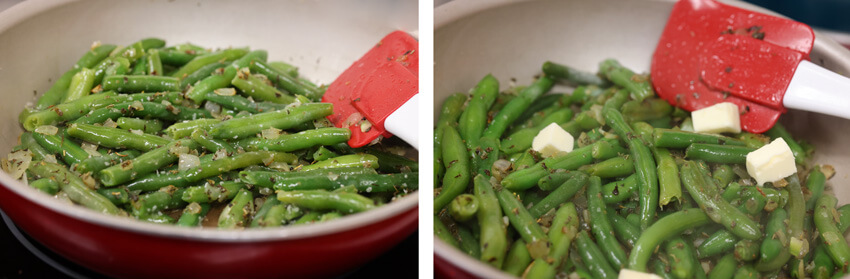 To finish, uncover and add the tablespoon of butter. Stir over the residual heat from your burner (you can turn off the stove at this point). The cold butter will emulsify into the warm liquid given off by the onions and beans and create a pan sauce.